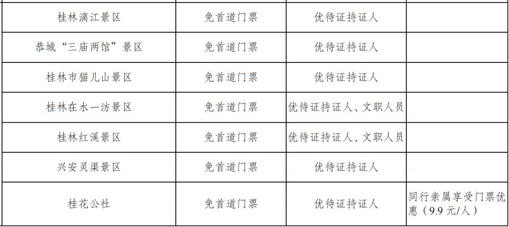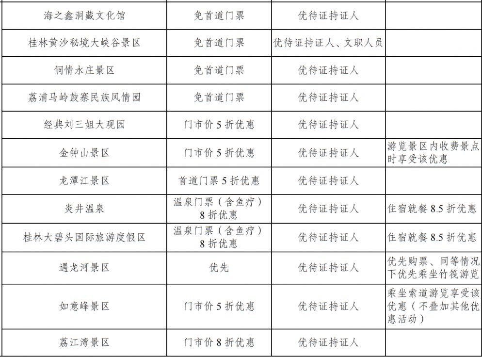 桂林退役军人优惠优待景区一览     图源:广西退役军人公众号 注:1.优待证持证人是指持有中华人民共和国退役军人优待证、中华人民共和国烈士遗属、因公牺牲军人遗属、病故军人遗属优待证的人员本人。优待证发放单位为全国各省(自治区、直辖市)退役军人事务厅(局)的均可享受,如对享受范围有限制的,将会在备注中注明限制范围。 2.现役军人凭有效证件、残疾军人凭《中华人民共和国残疾军人证》免费乘坐市内公共汽车、电车和轨道交通工具,在此优待项目清单中不再特别标注。 3.本项目清单所公布的项目因单位(企业)暂停营业、不可抗力因素或其他原因终止提供优惠优待服务的,由业主单位主动向社会公布,以实际执行情况为准,所印发的文件受限于客观条件不能及时更新,不具备强制执行力,敬请公众谅解。 举报