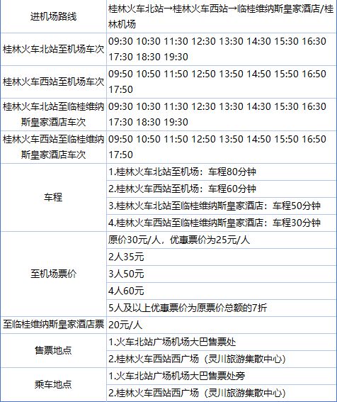 出行指南 1. "出发地点":桂林火车北站站前广场。 2. "到达地点":桂林两江四湖机场。 3. "票价":票价约为20元人民币。 4. "乘坐方式": - 从火车北站出站后,前往站前广场。 - 在站前广场找到前往机场的巴士站点。 - 乘坐巴士前往机场。 5. "注意事项": - 请提前查看巴士的实时发车时间,以避免错过。 - 巴士内通常有座位,但高峰时段可能需要站立。 - 行李请妥善保管,避免遗失。