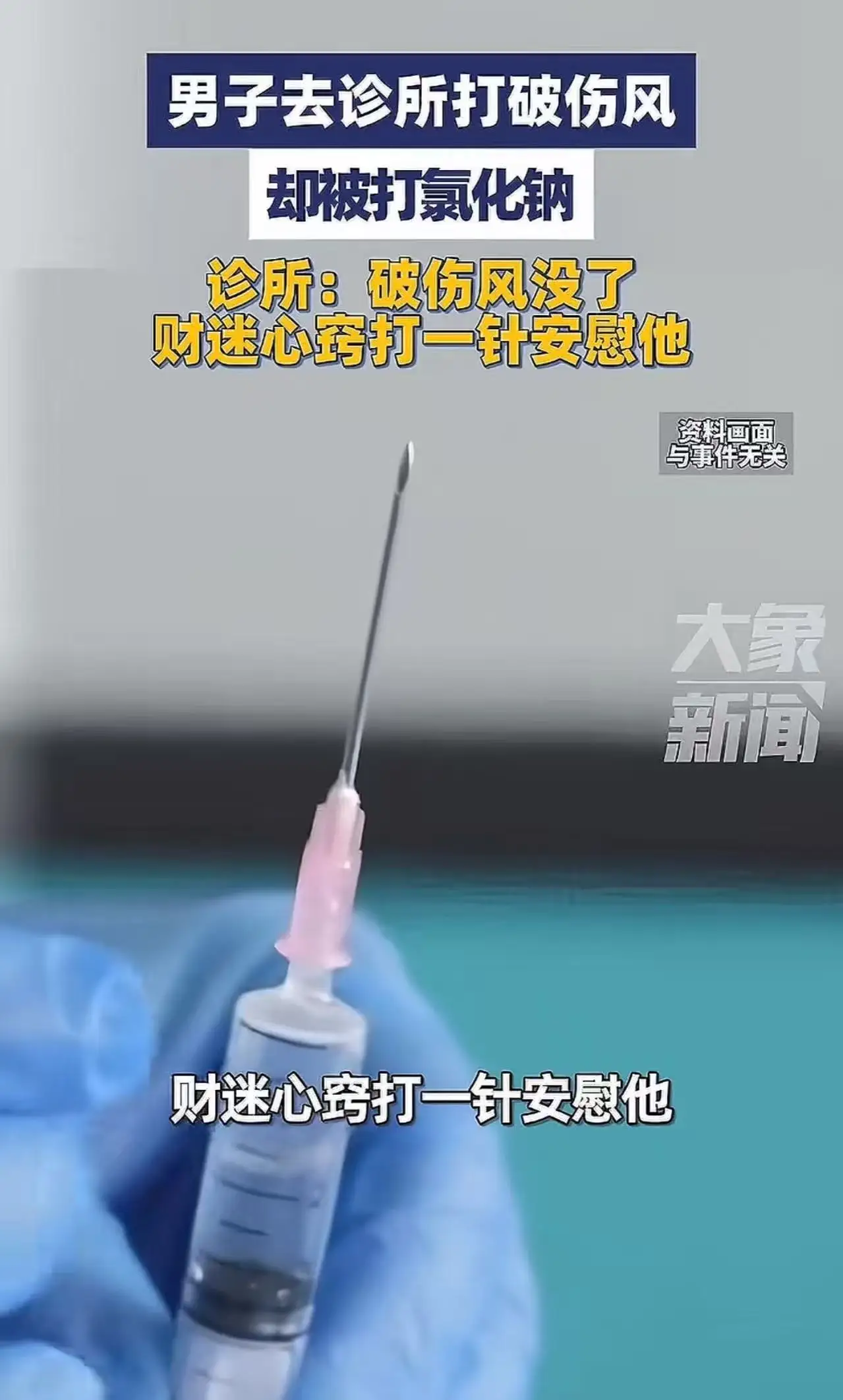万万没想到!广西桂林,男子去诊所打破伤风icon,却被打了氯化钠icon,诊所负责人:“破伤风没了,财迷心窍打一针安慰他!”网友:必须吊销行医执照,心术不正不能行医,如果没有发现,之后人没了怎么办?万万没想到!广西桂林,男子本以为只是普通的破伤风治疗,却没想到迎来了一场令人震惊的“医疗闹剧”。事情的起因很简单,他只是在诊所打破伤风针,没想到竟然被“打”了一针氯化钠!这究竟是怎么一回事?难道是误诊?还是医者的“心术不正”?事情曝光后,网友们的愤怒也如潮水般涌来,纷纷谴责这家诊所的医德败坏。